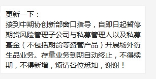 一家大型期货公司4月16日的内部通知显示:“接到中期协创新部窗口指导,自即日起暂停期货风险管理子公司与私募管理人以及私募基金(不包括期货等资管产品)开展场外衍生品业务。存量业务到期自动终止,不得续期,不得新增,烦请各位悉知,谢谢!”