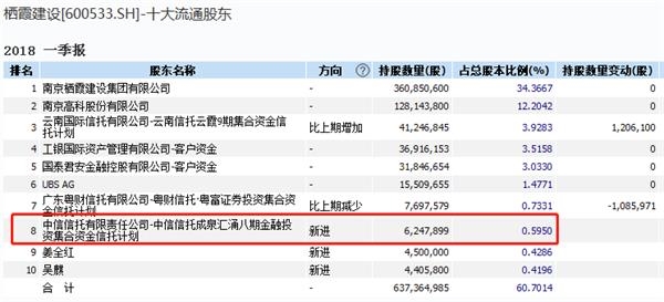 一季报显示,中信信托成泉汇涌八期位列栖霞建设第八大流通股东,持股数量为624.79万股,占总股本比例的0.6%。