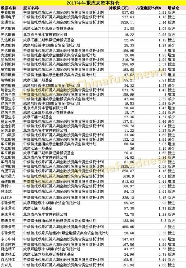 另外,2017年年报也显示,成泉资本目前持股超过20只,包括中直股份、银河电子、江山欧派、安奈儿、华立股份、绿茵生态、海利尔、顶点软件、宜通世纪、先达股份、百达精工、东珠景观、海峡股份、金逸影视等。
