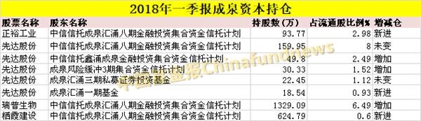 基金君盘点了一下成泉资本的最新布局情况。2018年一季报显示,除了买进栖霞建设,成泉资本还买了3只股票。成泉资本增持先达股份,旗下5只产品进驻了先达股份,分别占据第一、第二、第五、第七、第九大流通股东位置,持股数量达到281.07万股,占总股本比例的3.51%。先达股份是2017年上市的次新股,该公司从事除草剂的研发、生产及销售,成泉资本从2017年二季度首次现身其前十大流通股东以来,一直坚持持股。