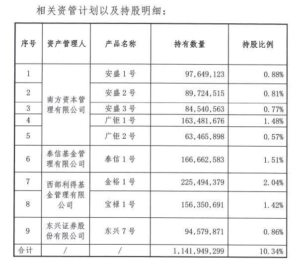 深圳市钜盛华股份有限公司与一致行动人合计持有万科股数为28.038亿股,占万科总股本比例为25.4%。而钜盛华通过九个资产管理计划合计持有万科股份11.4亿股,占万科总股本的10.34%。