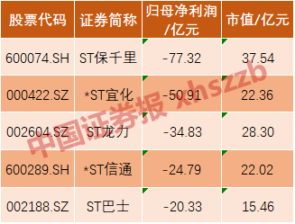 在A股2017年十大“亏损王”中,除了ST龙力,还有ST保千里、*ST宜化、*ST信通一年净利润亏损额也大于市值。