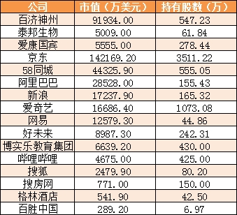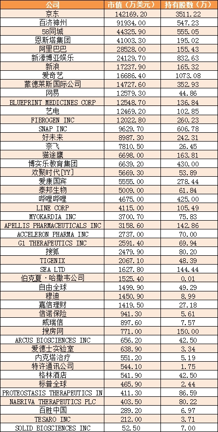 此外,高瓴资本持有金额超1亿美金的还有百济神州、58同城、恩斯塔集团、阿里巴巴、新濠博亚娱乐、新浪、爱奇艺、蒙德莱斯国际公司、网易、BLUEPRINT MEDICINES CORP、艺电和FIBROGEN INC等12家企业,金额分别从1.2亿美金到9.1亿美金不等。
