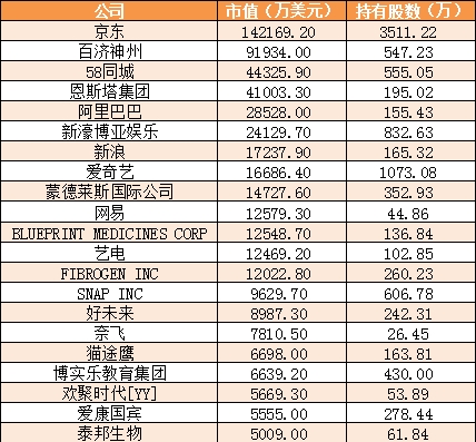 据基金君统计,一季度末高瓴资本共持有16只中概股,持有市值达38.83亿美元。这16只中概股包括京东、58同城、阿里巴巴、新浪、爱奇艺、好未来等我们熟悉的企业。
