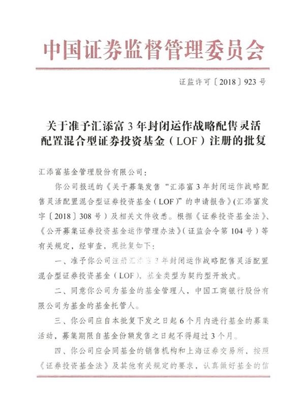关于准予汇添富3年封闭运作战略配售灵活配置混合型证券投资基金(LOF)注册的批复