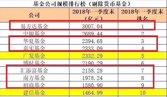 这6家基金公司实力都很强,易方达、华夏和嘉实基金公司2018年一季度末非货币规模分别为3007亿,2394亿和2333亿,名列第一、第三和第四。汇添富、南方和招商基金公司的实力也非常强,分别以2158亿、1978亿和1581亿,名列第7到第9名。