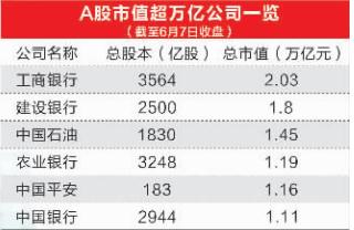 其实,除了贵州茅台之外,A股市场中还有多家市值已破万亿元。即便按贵州茅台在6月6日盘中最高价计算,其在A股市场“万亿元市值俱乐部”当中也只能屈居第七位。