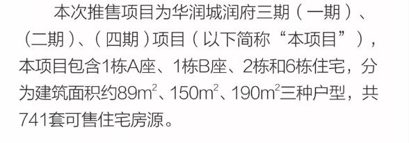 这一期华润的楼盘包含1栋A座、1栋B座、2栋和6栋住宅,分为建筑面积约89㎡、150㎡、190㎡三种户型,共741套可售住宅房源。