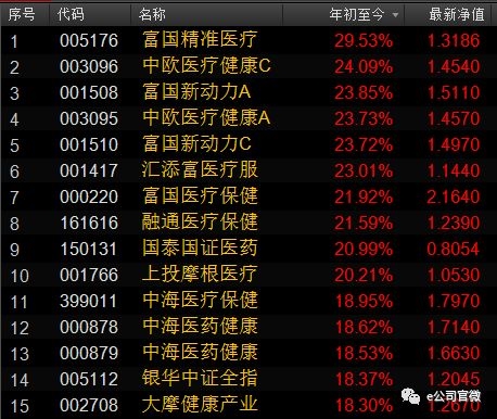 这种吃药行情催生了不少牛基金。数据显示,年初至今,净值涨幅最大的前15只开放式基金(非货币和QDII)中,绝大部分都是医药大健康类基金。