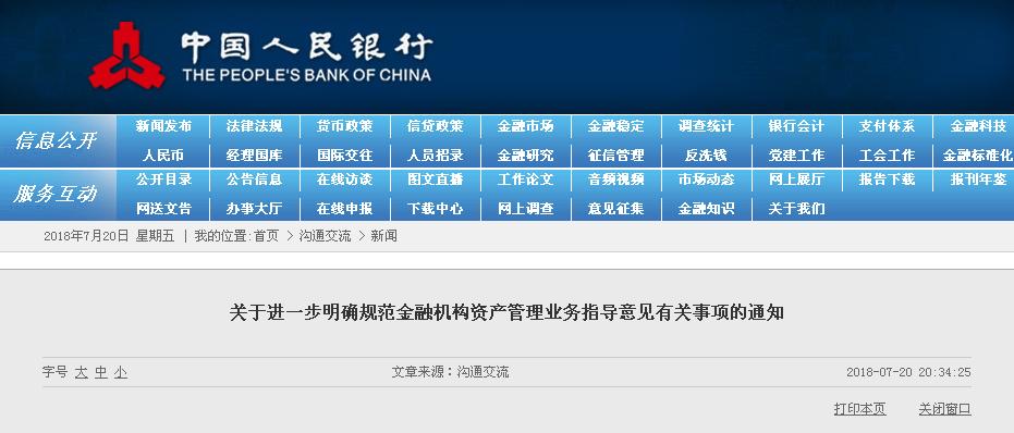 央行进一步明确《金融机构资产管理业务指导意见》有关事项