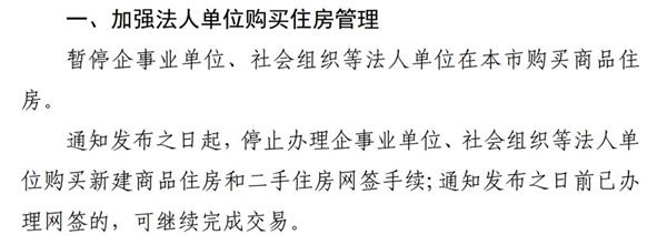 通知发布之日起, 停止办理企事业单位、 社会组织等法人单位购买新建商品住房和二手住房网签手续;通知发布之日前已办理网签的, 可继续完成交易。