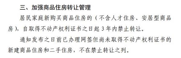 居民家庭新购买商品住房的(不含人才住房、 安居型商品房),自取得不动产权利证书之日起 3 年内禁止转让。通知发布之日前已办理网签但尚未取得不动产权利证书的新建商品住房和二手住房,不在禁止转让之列。