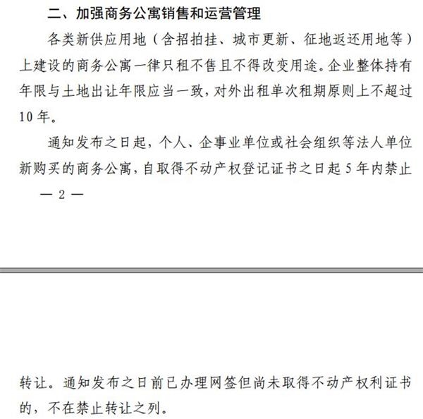 通知发布之日起,个人、企事业单位或社会组织等法人单位新购买的商务公寓, 自取得不动产权登记证书之日起5年内禁止转让。 通知发布之日前已办理网签但尚未取得不动产权利证书的,不在禁止转让之列。