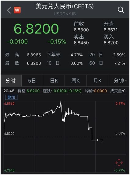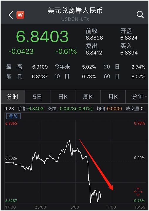 消息传来,全球外汇市场应声而动。离岸人民币兑美元短线上涨逾500点,瞬间突破6.88、6.87、6.86、6.85、6.84、6.83六大关口,日内最低价6.8287。而此前,汇率一度跌破6.9关口。