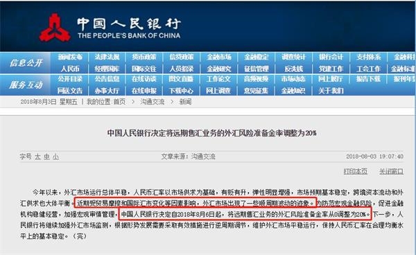 央行表示,近期受国际汇市变化等因素影响,外汇市场出现了一些顺周期波动的迹象。为防范宏观金融风险,促进金融机构稳健经营,加强宏观审慎管理,中国人民银行决定自2018年8月6日起,将远期售汇业务的外汇风险准备金率从0调整为20%。下一步,人民银行将继续加强外汇市场监测,根据形势发展需要采取有效措施进行逆周期调节,维护外汇市场平稳运行,保持人民币汇率在合理均衡水平上的基本稳定。