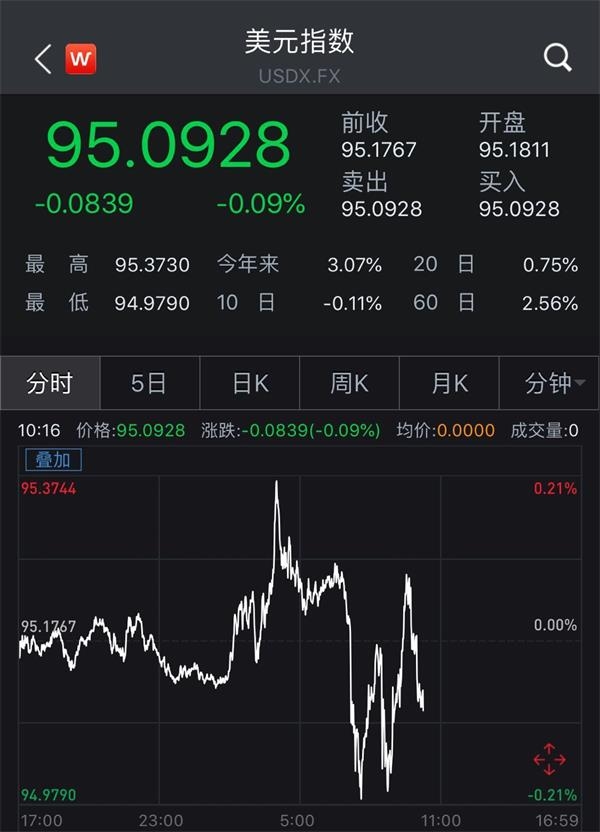 但美元指数则止涨转跌,重返95关口。