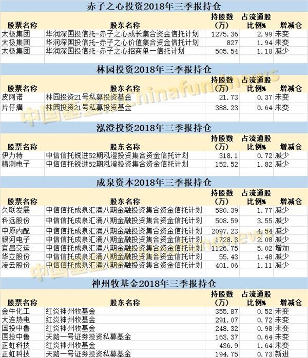 明达资产三季度新进了齐心集团,持有839.88万股,占流通股1.31%;凯丰投资三季度减持了旗滨集团、杭氧股份,目前分别持有703.71万股、1152.38万股,占流通股比例分别为0.27%、1.22%;敦和资产三季度新进了上海洗霸,减持了水星家纺。