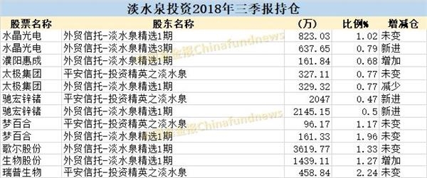 今年三季度,淡水泉投资大幅增持了驰宏锌锗,两只产品新进、一只产品退出,合计持有4192.15万股,占流通股的0.97%;同时,增持了水晶光电,外贸信托-淡水泉精选3期新进该股,外贸信托-淡水泉精选1期则持股不变,两者合计持有1460.68万股,占流通股的1.81%;另外还小幅增持了濮阳惠成。同时,淡水泉对瑞普生物、梦百合保持持股不变,分别持有458.84万股、257.5万股。另外,淡水泉仍持有生物股份1439.11万股。