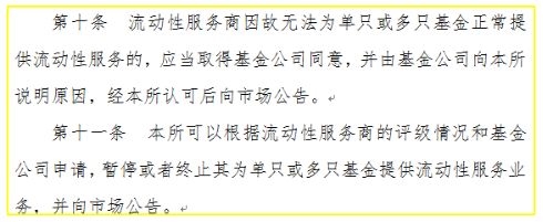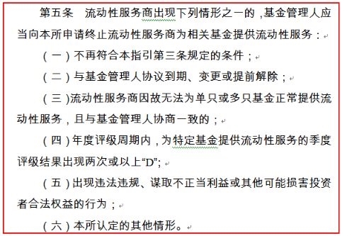 同时,深交所《指引》规定,当流动性服务商出现不再符合《指引》中规定的应当具备的条件,或者与管理人的协议出现到期、变更或提前解除,或年度评级周期内,为特定基金提供流动性服务的季度评级结果出现两次或以上的“D”等情况,基金管理人应当向深交所申请终止流动性服务商为相关基金提供流动性服务。