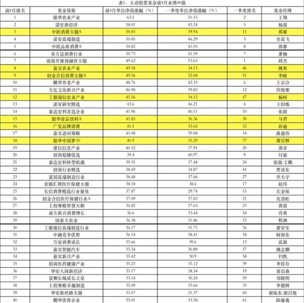 从前4月业绩数据看,主动股票基金方面,王翔管理的银华农业产业以63.1%的收益率位居前4月业绩冠军,受益农业板块4月份逆势大涨,该基金前4月收益率比一季度提高了接近12个百分点,诺安新经济则以8.01%的收益率位居次席,其单位净值涨幅更是比一季度提高了超过14个百分点。中欧消费主题也是强势挺进三甲,以50.85%的收益率排名第三。