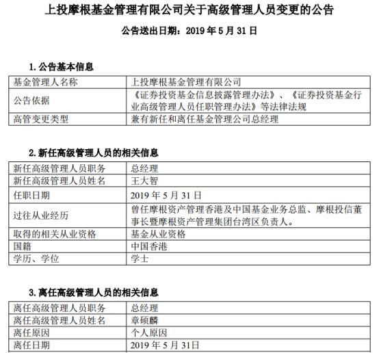 今天上午,上投摩根基金发布高管变更公告称,原总经理章硕麟因个人原因离任,新任总经理是王大智,任职日期是5月31日。