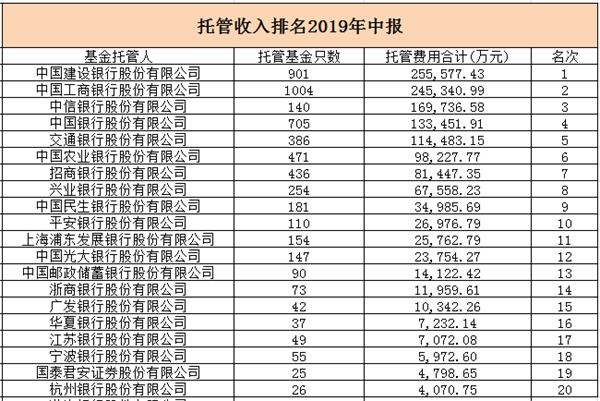 公募基金托管费用方面,建设银行成为最赚钱的托管人。根据2019年托管费用中报,建设银行托管基金费用高达25.56亿元。工商银行、中信银行等17家银行包揽了第二到第十八名。托管费用最高的券商托管人为国泰君安证券,托管基金费用为4798.65万元,还不及建设银行这方面费用的零头。