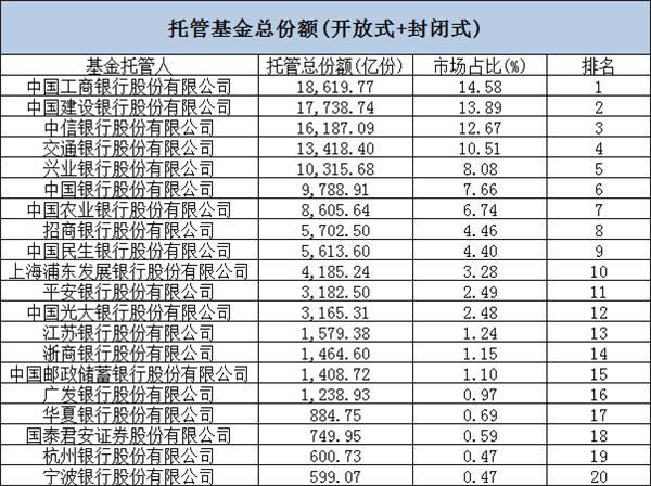 数据显示,截至7月9日,托管公募基金总份额前17名被商业银行牢牢占据。其中,工商银行以1.86万亿份拿下第一;建设银行、中信银行、交通银行、兴业银行托管总份额均破万亿份;券商托管总份额第一的是国泰君安证券,托管总份额为749.95亿份。