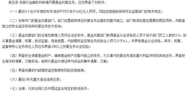 随后,中国证监会与中国银监会联合发布《证券投资基金托管业务管理办法》(下称《管理办法》),自2013年4月2日起施行。