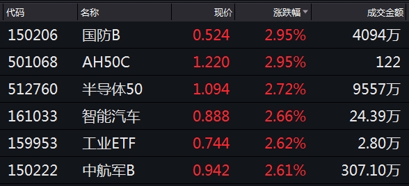场内基金方面,受消息刺激,军工主题基金表现亢奋,其中,国防B涨2.95%、中航军B涨2.61%,合计成交金额约为4400万元。