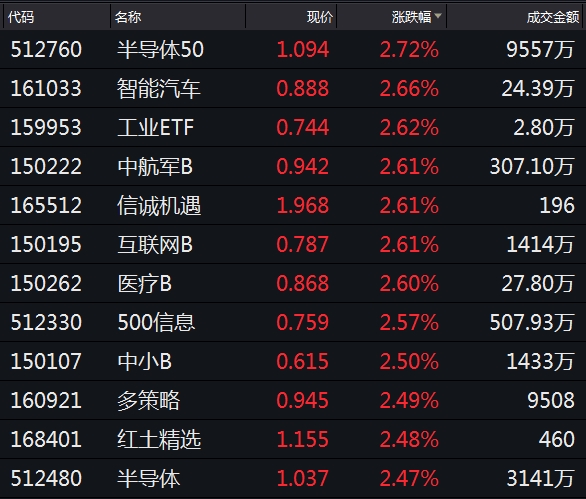 科技类主题基金表现亦不俗,其中,半导体50涨2.72%、互联网B涨2.61%、500信息涨2.57%、半导体基金涨2.47%,合计成交金额约为1.46亿元。