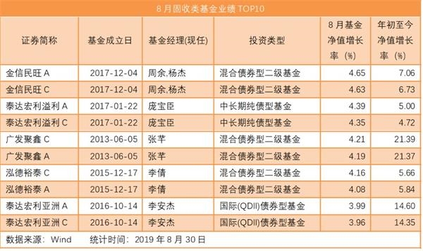 数据显示,截至8月30日,固收类基金8月业绩TOP10净值均较年初上涨了3.96%,其中涨幅最大的三只产品分别为金信民旺A、金信民旺C和泰达宏利溢利A,8月至今基金净值分别增长了4.65%、4.63%和4.39%。