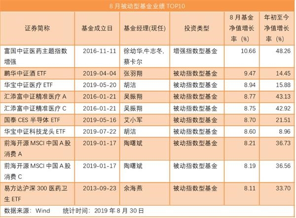 另外,国泰CES半导体ETF、华宝中证科技龙头ETF、前海开源MSCI中国A股消费A、前海开源MSCI中国A股消费C和易方达沪深300医药卫生ETF也上榜8月被动型基金业绩TOP10,涨幅在同类基金中居前。