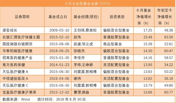 将权益基金按照是否主动划分为主动型基金和被动型基金,在本文盘点中,主动型基金还包含商品类基金和一些另类投资基金,如REITS及股票多空基金等。数据显示,8月收益TOP10的基金单月净值增长均超过13%,主题集中在医药、TMT和贵金属方面。