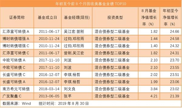 数据显示,截至8月30日,年初至今增幅最大的固收类基金是由吴江宏和曾刚管理的汇添富可转债A,年初至今上涨24.66%。而前五中的另外四只是博时转债增强A、博时转债增强C、汇添富可转债C和中欧可转债A,净值分别较年初上涨24.58%、24.32%、24.31%和23.70%。