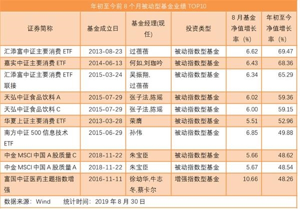 此后才是,南方中证500信息技术ETF、中金MSCI中国A股质量C、中金MSCI中国A股质量A和富国中证医药主题指数增强。整体来看,年初至今前8个月被动型基金业绩TOP10均取得了不错的业绩,年初至今净值上涨超48%。