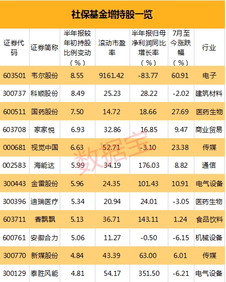 数据宝统计显示,社保基金二季度大幅加仓电子行业公司,7月至今,多只个股涨幅超50%,如韦尔股份、北京君正、生益科技等。