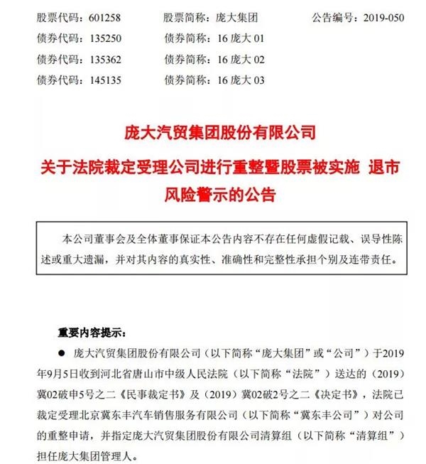 中国昔日最大的汽车经销商庞大集团,又凉了半截,欠了别人1700万还不起之后,在5月份被债权人申请重整,终于被法院受理。
