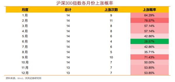 报告指出,一年之中,沪深300指数在2月和9月的上涨概率最高,都超过了70%,6月的上涨概率最低,不到30%;从A股60大重点行业来看,2月和11月,上涨概率超70%的行业数量最多。