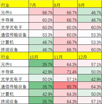 从统计数据来看,元件、半导体、计算机、光学光电子、通信传输设备、终端设备等科技成长板块,三季度整体上涨概率可达60%以上,但进入四季度后出现明显下降。