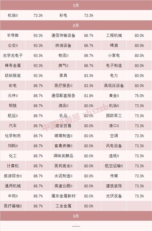 值得注意的是,2月出现普涨行情的概率较大。在A股60大重点行业中,2月上涨概率超70%的行业多达53个,上涨概率超80%的行业达到42个,是一年之中数量最多的月份。