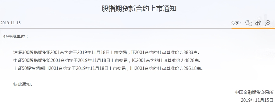 上证50股指期货IH2001合约定于2019年11月18日上市交易,IH2001合约的挂盘基准价为2961.8点。