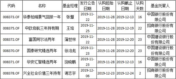 除兴全社会价值三年持有之外,其余5只产品已全部发行。其中,华泰柏瑞景气回报一年和华安汇智精选两年均认购16天,已于上周五发行完毕,是最早结束募集的两只基金。其余产品也将在本周内发行完毕,中欧启航三年持有期于昨日结束认购,富国阿尔法两年、国泰研究精选两年的认购截止日是今天。