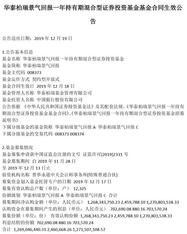 华泰柏瑞公告,华泰柏瑞景气回报一年于2019年12月18日成立,募集金额12.7亿元,有效认购户数12325户,募集期间基金管理人的从业人员认购基金20.39万份,占比0.016%。
