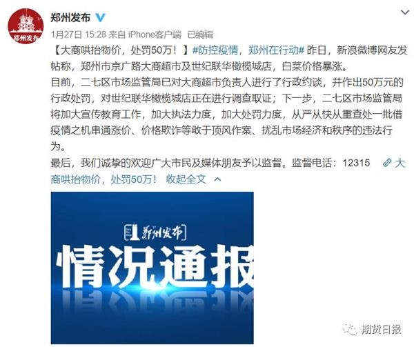 郑州市相关部门很快做出处理。27日,郑州市委宣传部通报称,郑州场监管局介入调查,对大商超市负责人进行了行政约谈,并作出50万元的行政处罚。同日郑州市市场监管局就疫情防控期维护防疫用品和生活必需品市场价格秩序发出通告称,郑州严禁哄抬物价,构成犯罪的将依法追究刑事责任