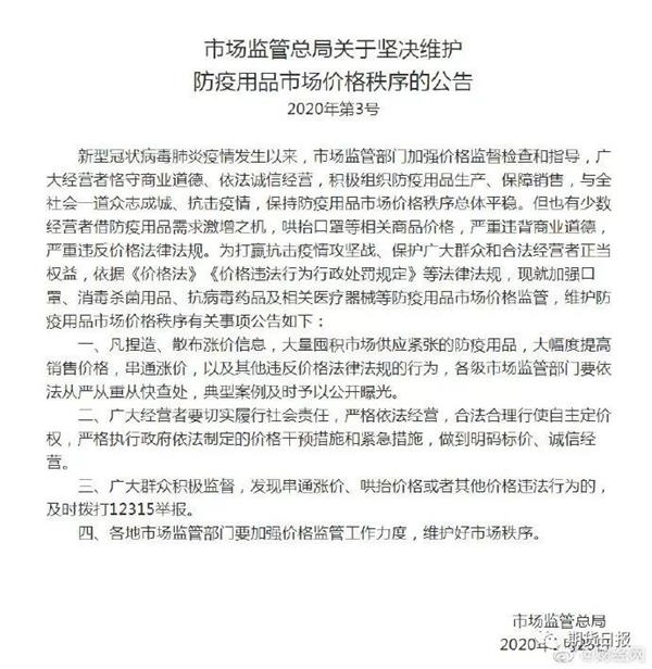 而早在25日,国家市场监管总局就发布关于坚决维护防疫用品市场价格秩序的公告。公告指出,新型冠状病毒肺炎疫情发生以来,有少数经营者借防疫用品需求激增之机,哄抬口罩等相关商品价格,严重违背商业道德,严重违反价格法律法规。公告称,凡捏造、散布涨价信息,大量囤积市场供应紧张的防疫用品,大幅度提高销售价格,串通涨价,以及其他违反价格法律法规的行为,各级市场监管部门要依法从严从重从快查处,典型案例及时予以公开曝光。广大群众积极监督,发现串通涨价、哄抬价格或者其他价格违法行为的,及时拨打12315举报。各地市场监管部门要加强价格监管工作力度,维护好市场秩序。