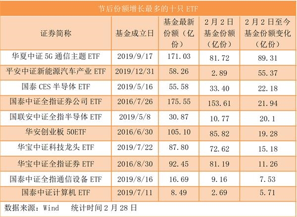 同时,在2020年以前成立的存量ETF中,5G通信、半导体、创业板、证券等都是投资者加仓的重点。Wind数据显示,截至2月28日,节后至今份额增量最多的十只ETF中,通信、半导体、证券相关ETF各两只,另4只则是新能车、创业板50、科技ETF和计算机ETF,这10只基金与节前相比增加了近270亿份,其中份额增长最多的当属华夏中证5G通信主题ETF,较年初增长89.31亿份。