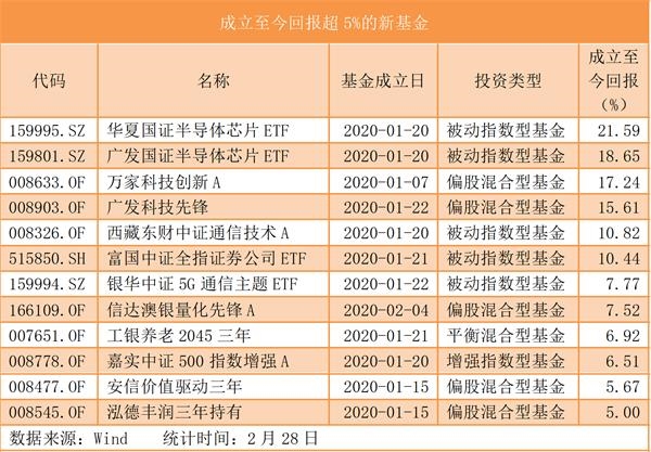 今年以来,已成立了144只公募基金合计3124.07亿份。《每日经济新闻》记者注意到,不少基金快速建仓,其中今年才成立的新基金中,已有12只产品为投资人赚取了超5%的回报。不难看出,快速建仓的半导体芯片、5G及科技主题类基金回报丰厚。与此同时,分别成立于2月4日和10日的信达澳银量化先锋和万家自主创新也快速建仓,截至2月28日发稿,成立以来分别赚7.53%和3.27%。