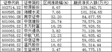本周前4个交易日融资净买入额排名前十的股票中,除了军工股中航飞机外,其余9只股票均与养殖、基建、券商三大板块有关。值得注意的是,这10只融资净买入额排名靠前的股票,同期股价全部收获上涨,且平均涨幅高达13.29%,显著跑赢三大股指。
