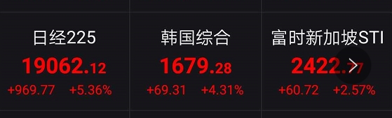 亚洲其他市场风险偏好明显提升。截至11:30,恒生指数涨2.19%,韩国综合指数涨4.31%,富时新加坡STI涨2.57%,日经225涨5.36%。