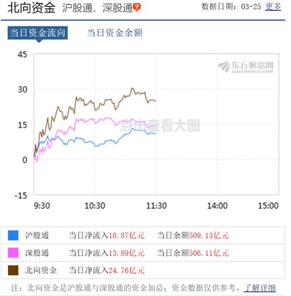 资金流向方面,东方财富网数据显示,截至25日午间收盘,北向资金合计净流入资金24.76亿元;其中沪股通资金净流入10.87亿元,深股通资金净流入13.89亿元。前一日北向资金合计净流入39.87亿元。